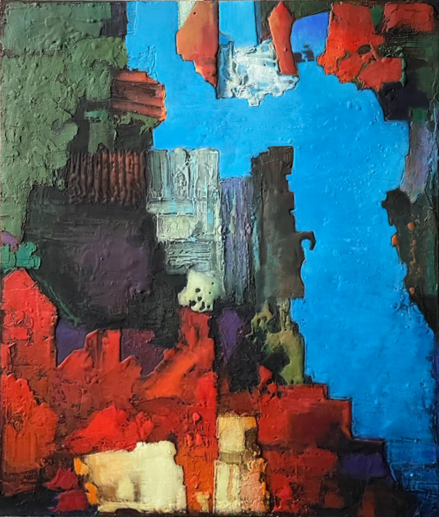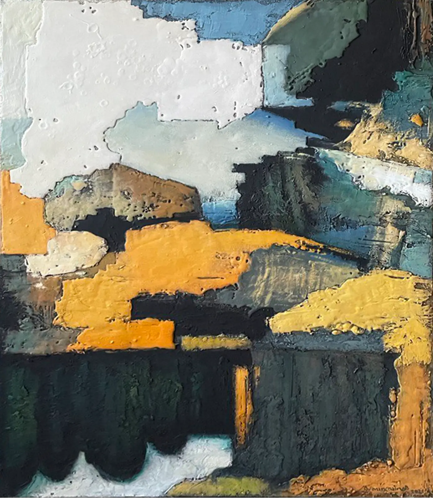 В залитых левкасом холстах сокрыта пластика, а перетекание формы создает многослойность, из которой произрастает трехмерное пространство произведений. Эта живописная скульптура погружает нас в созданный автором мир и открывает истинную суть вещей.